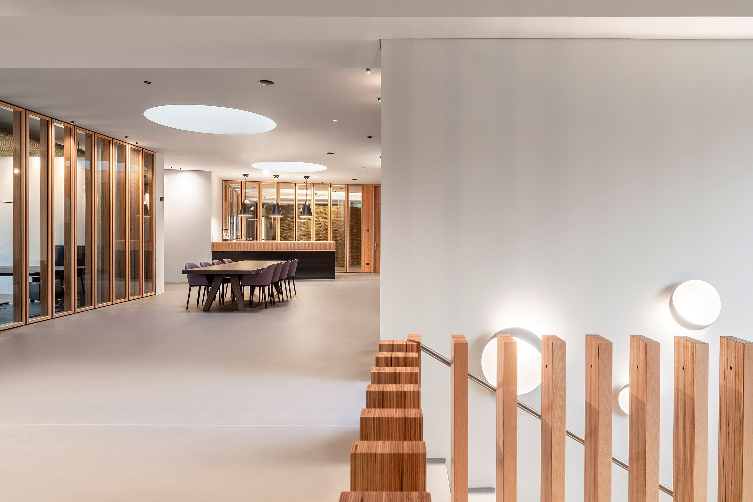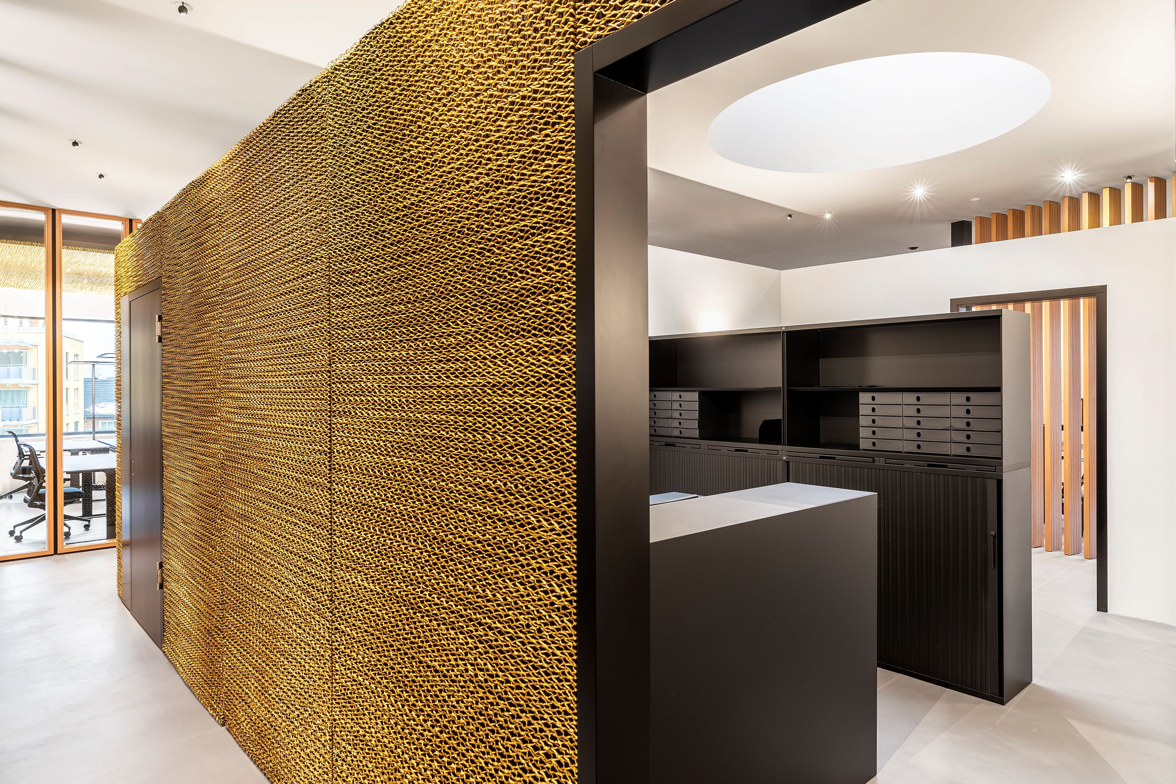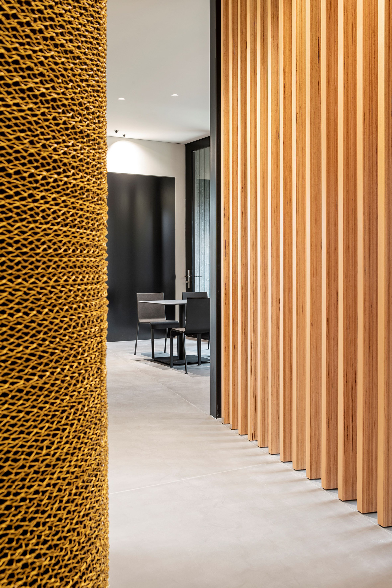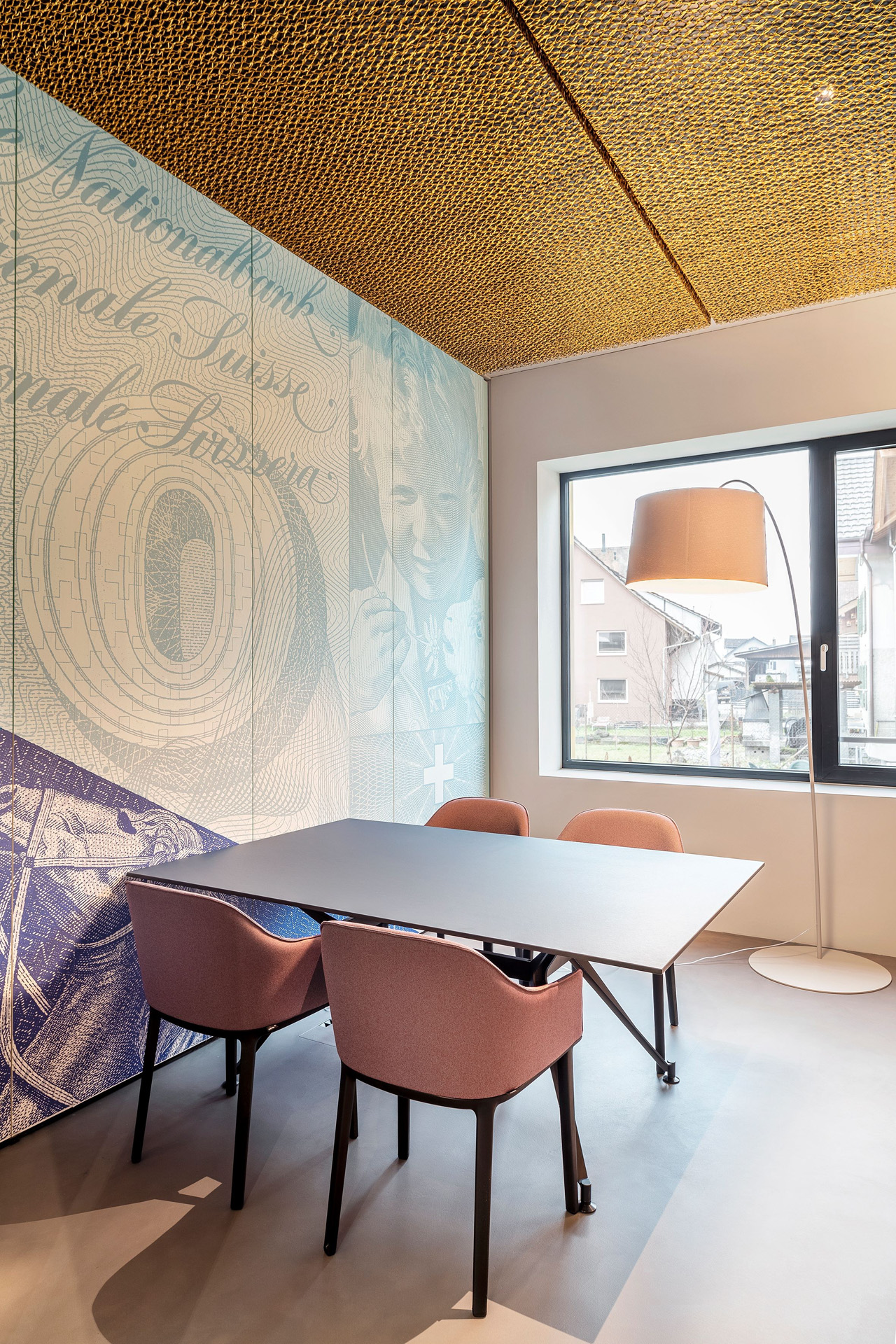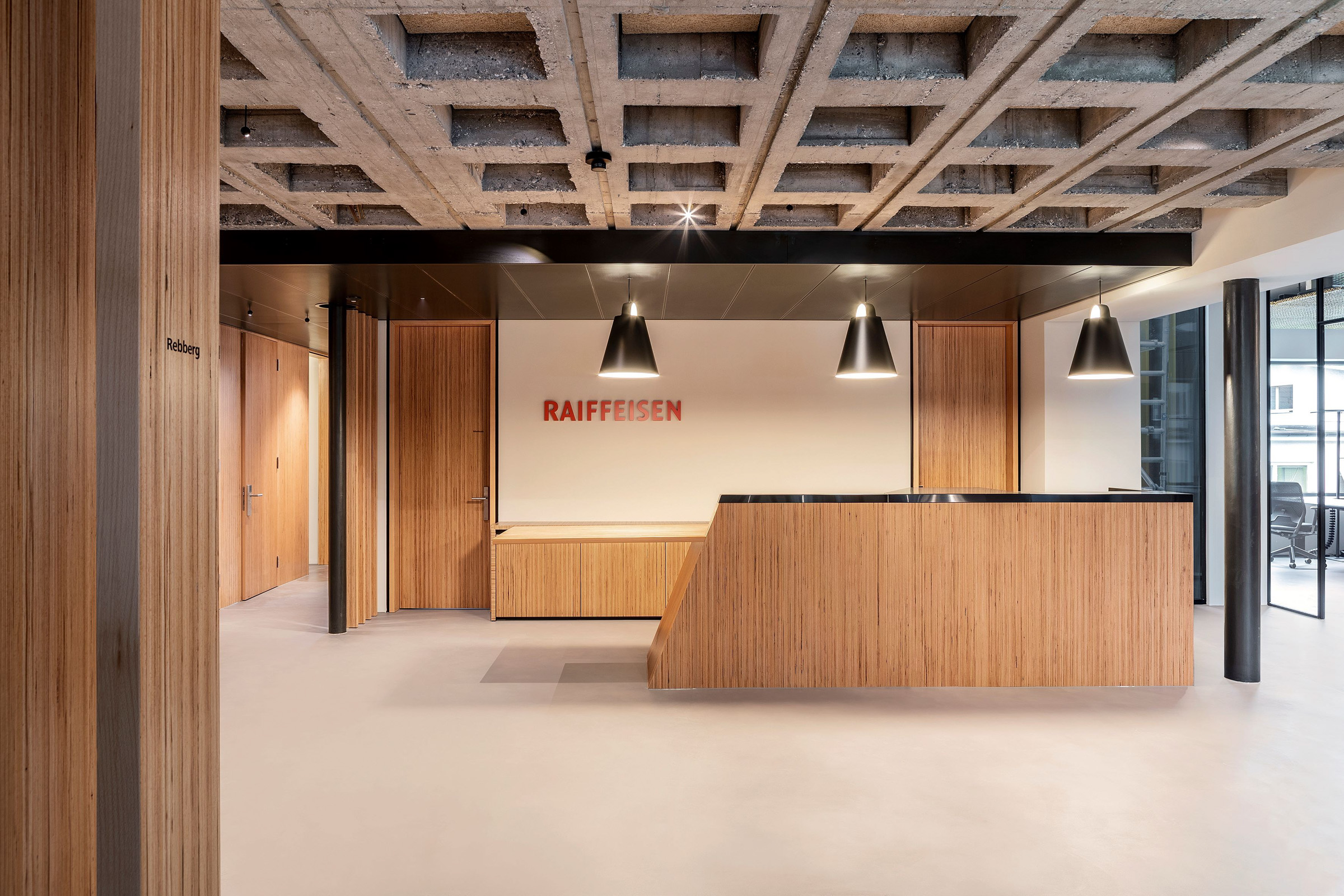 Industrial lobby interior with wooden reception desk, Raiffeisen sign, and seating area under a grid concrete ceiling with pendant lights.